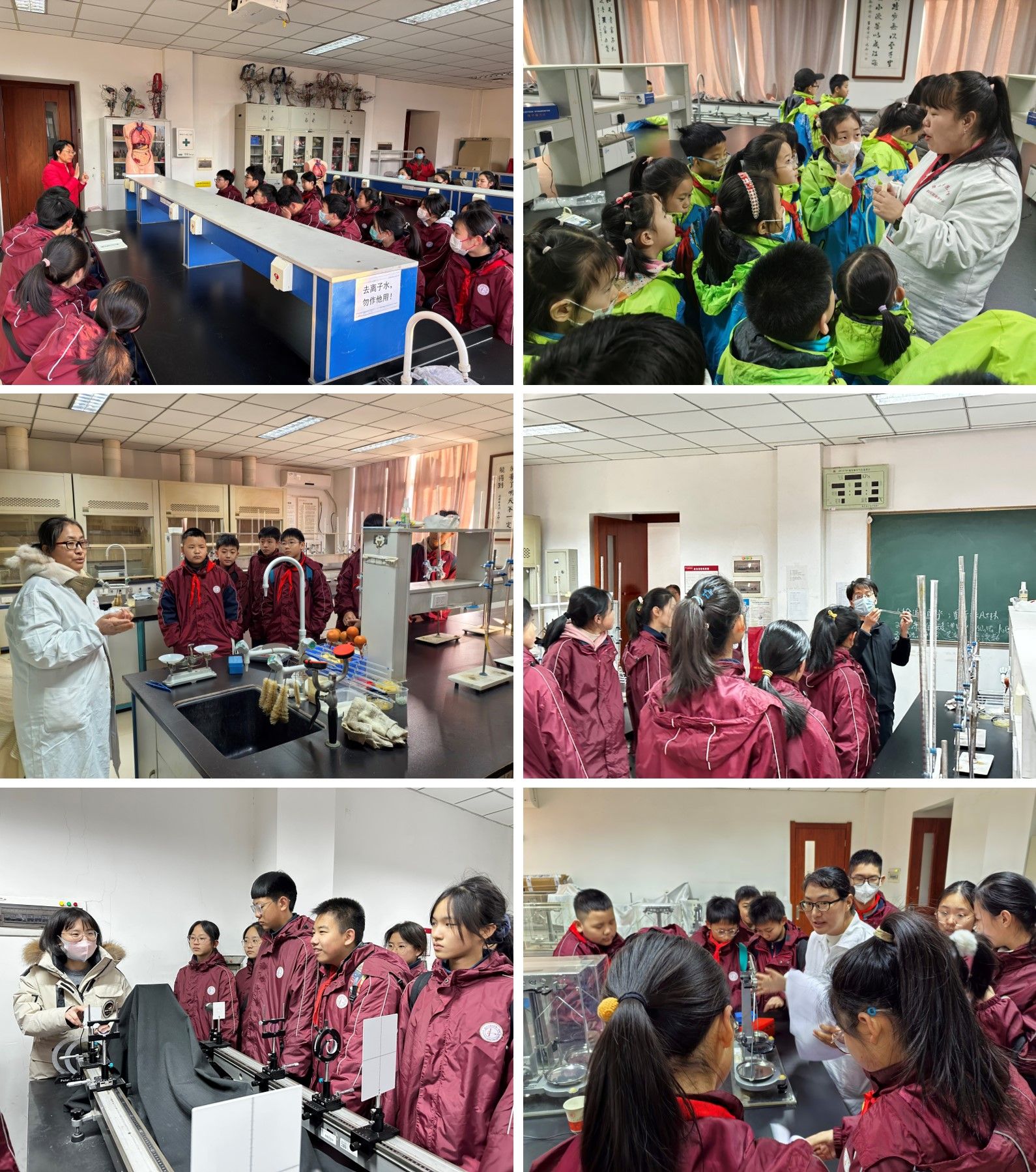 同时,基地充分发挥多学科融合优势,同时开放力热、光学、物理化学、生物和食品科学等专业学科实验室,推动大学实验课堂与中小学生科学教育的有效衔接。生物实验室刘清梅老师向学生们讲解了身体的构造,对人体不同器官的功能进行了科普;食品实验室马志爽老师与学生互动了握力计、肺活量测试等小游戏,并科普相关健康知识;力热实验室卫芬芬老师给学生们介绍了传统的天平构造和使用等;光学实验室石静瑜老师跟同学分享了透镜成像、偏振光方面的知识等;物化实验室魏彦林老师和申海霞老师给学生讲述了电子天平和酸度计的使用、水的硬度检测和家用食醋的酸度相关知识等。