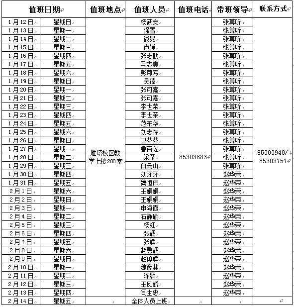 2020年寒假值班安排表