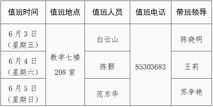 2.值班期间如遇有紧急、重要事项或突发事件,应立即联系带班领导并向学校总值班室(校务楼110室,85310005)报告并妥善处置;