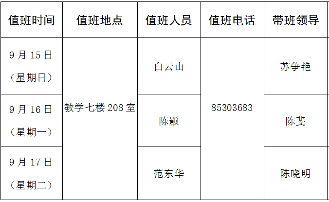 2.值班期间如遇有紧急、重要事项或突发事件,应立即联系带班领导并向学校总值班室(校务楼110室,85310005)报告并妥善处置;