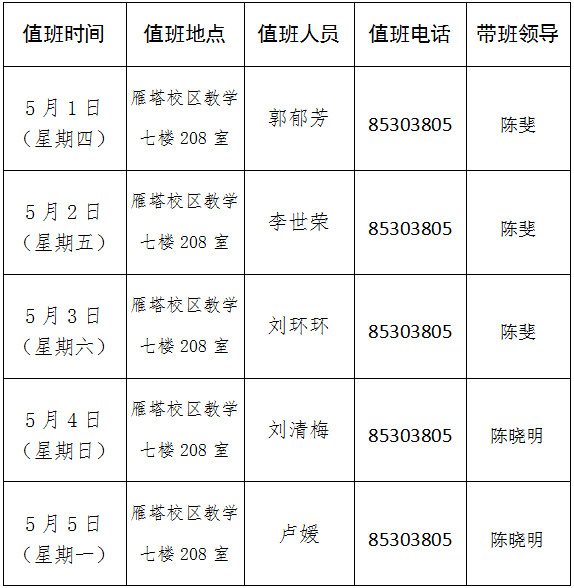 2.值班期间如遇有紧急、重要事项或突发事件,应立即联系带班领导并向学校总值班室(校务楼110室,85310005)报告并妥善处置;